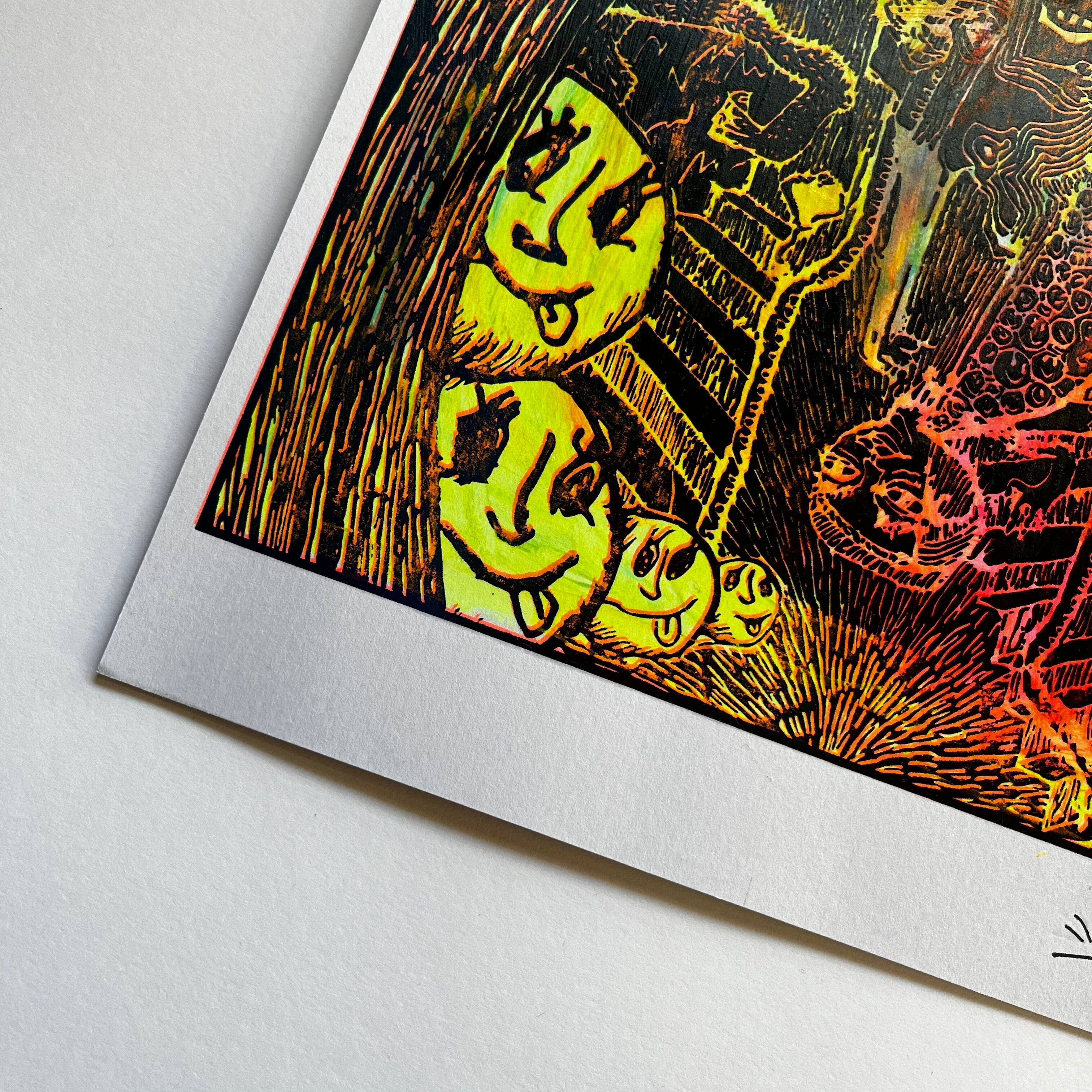 ドローイング作品をデジタルコラージュしシルクスクリーンの版におこし、紙の上にさまざまな技法でシルクスクリーンプリントした一点物。6枚制作のうちの1枚、ナンバリング付き。